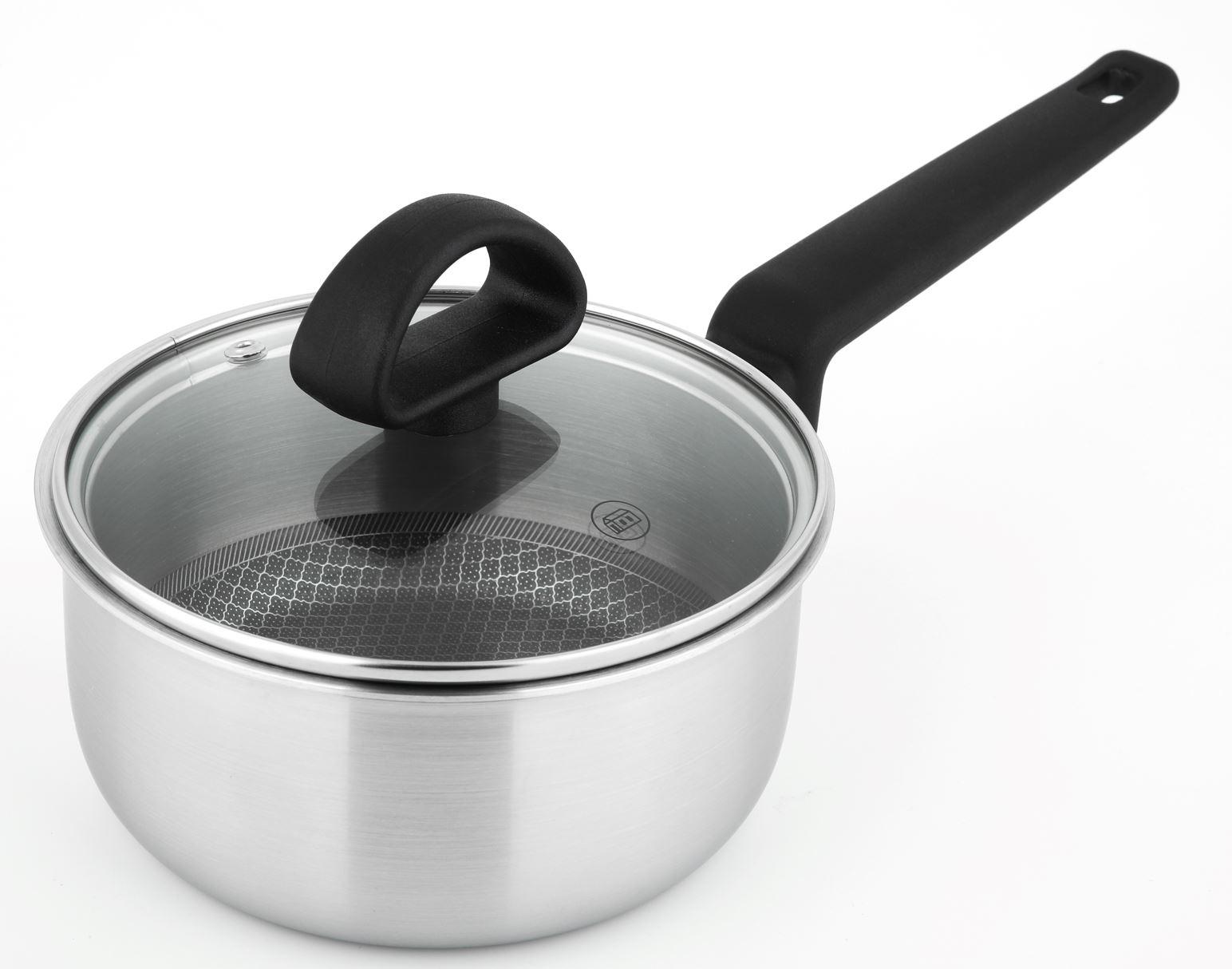 1)優質不鏽鋼,抗腐蝕性強、堅硬無比、非常耐用。 2)三層無縫鍋身結構:采用無縫設計的三層結構鍋身,以兩層不銹鋼夾著中間的極厚鋁層,保証傳熱迅速及熱力均勻 3)磁性不銹鋼外層 ,適用於各種爐具包括電磁爐;極厚鋁層:快速傳熱,熱力均勻;食品級不銹鋼內層:接觸食物無化學反應 4)由於極厚鋁層全面覆蓋鍋身,利用鋁金屬傳熱快速的特性,即使火力在底部加熱,亦能夠快速及均勻地傳遞到整個鍋身。令食材保持在同一溫度下烹調,不會令部分食材過熟或部分食材過生。 5)蝕刻納米紋設計成一個高低層表面紋路,大量減少與食材的接觸面,在煮食過程中,油在沸騰後會產生一層氣膜,從而將食材與鍋分隔開來而實現不粘,因此即使用極少量的油亦能達到少油烹調及健康煮食。 6)無鉚釘設計:方便清洗、不藏食物殘渣 7)高低層蝕刻花紋結構,增加物理不黏性能,做到絕佳不黏效果。 8)適合各類型煮食爐,包括電磁爐。